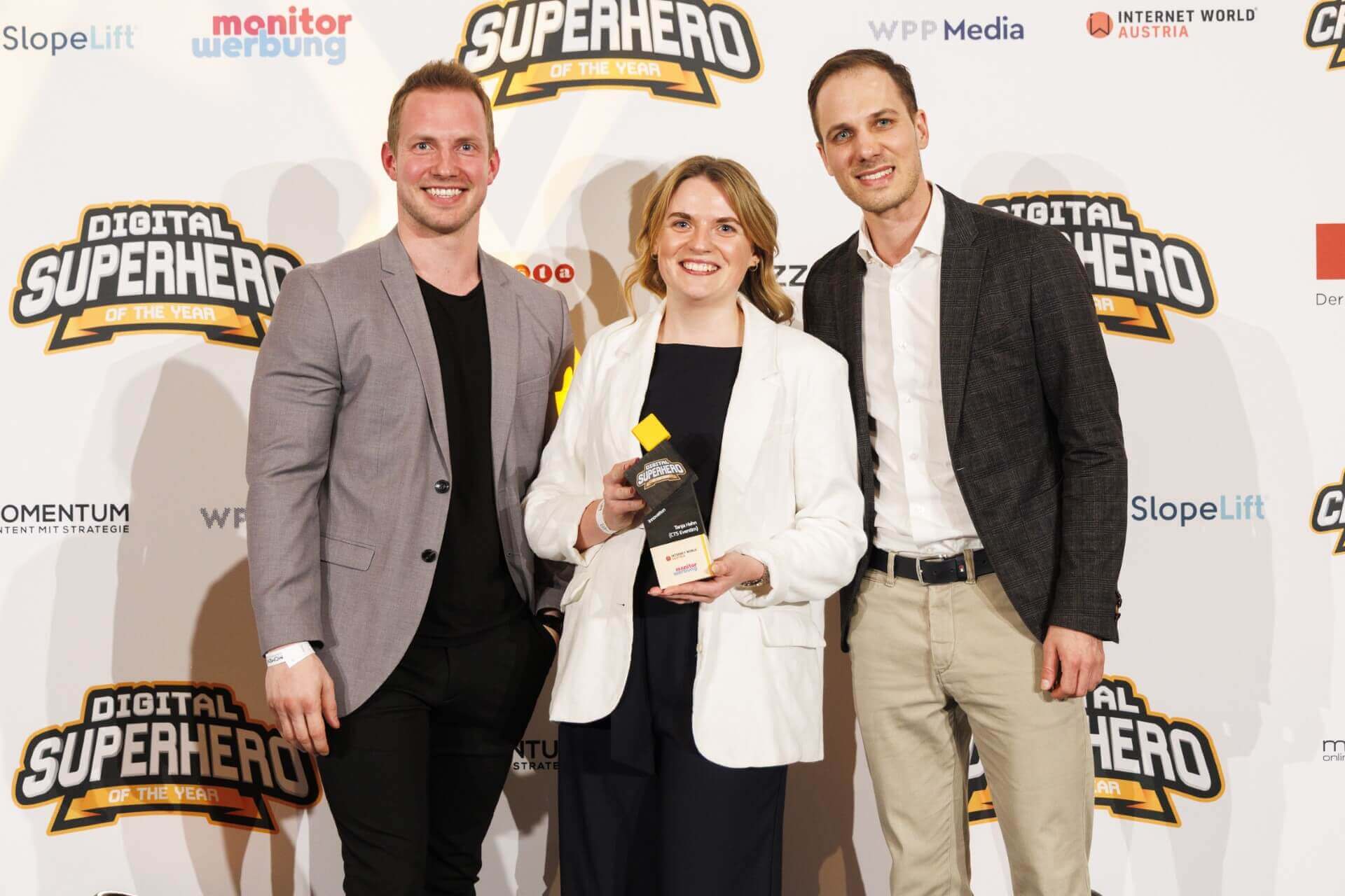 Tanja Hahn (CTS Eventim) wurde zum Digital Superhero of the year 2025 in der Kategorie Innovation gewählt. Josef Maier vom Kategoriensponsor monitorwerbung und iab-Austria-Präsident Hannes Wurzwallner gratulieren.