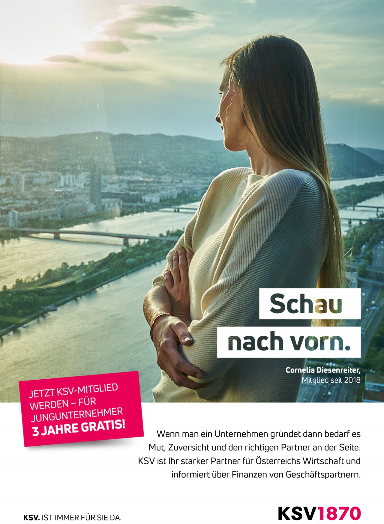 Die Kampagne, die über den Dächern Wiens auf dem DC-Tower geshootet wurde, verspricht Jungunternehmen unter anderem eine dreijährige Gratis-Mitgliedschaft beim KSV1870. Die Online-Kampagne setzt auf animierte Banner und wird von Hörfunk-Spots und Printanzeigen flankiert. Barbara Mayerhofer, Marketingleiterin beim KSV1870, ist mit dem Endergebnis der Zusammenarbeit mit JANDL Wien hochzufrieden: „Die Nachhaltigkeitsexpertin Cornelia Diesenreiter ist das perfekte Testimonial für unsere neue Mitglieder-Kampagne. Gerade jetzt, in dieser für Unternehmer schwierigen Zeit, ist der KSV1870 als starker Partner an der Seite von Jungunternehmen besonders wichtig.“