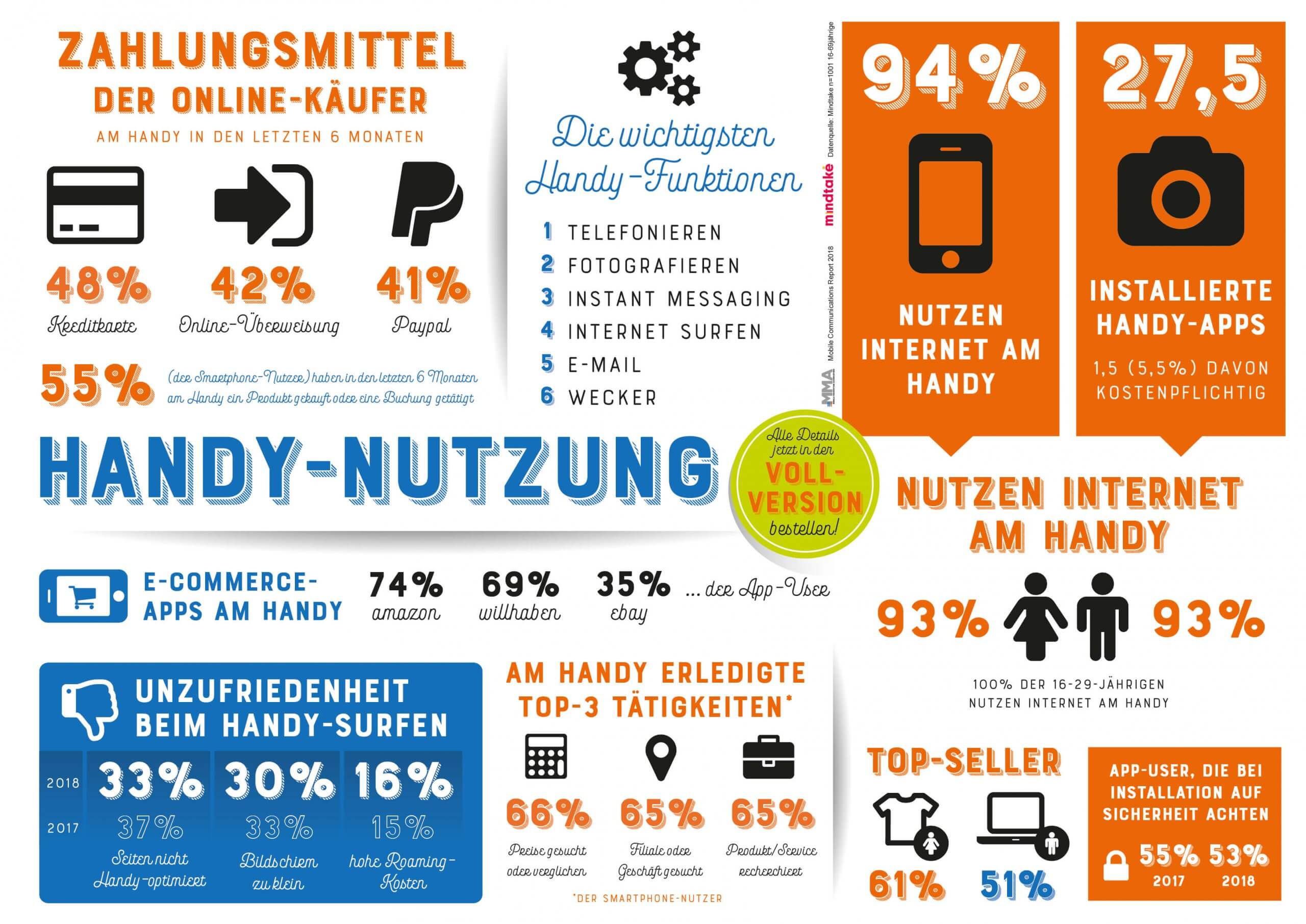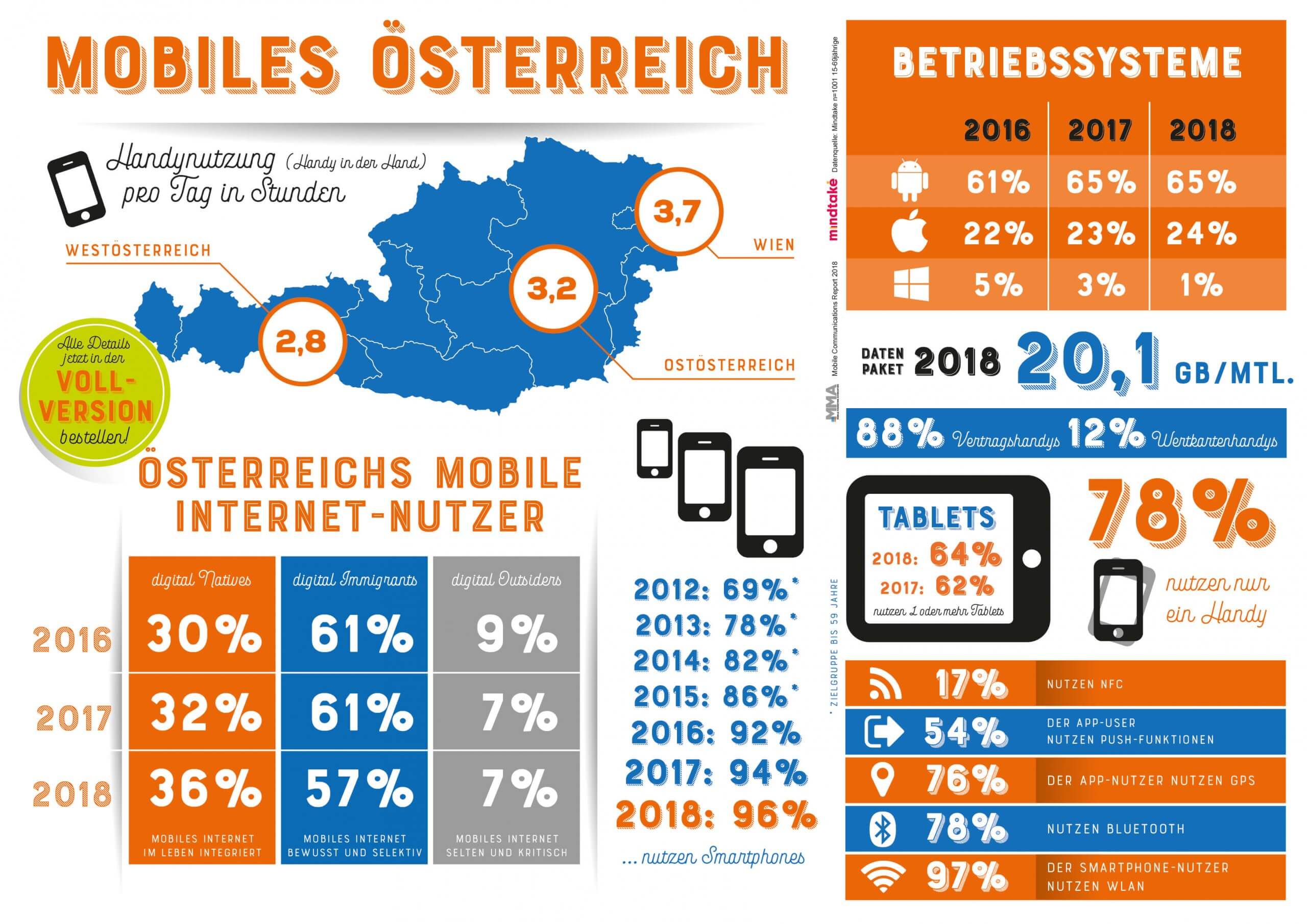 Die Studie Mobile Communications Report 2018 wurde in Kooperation der MMA Austria und dem Marktforschungsinstitut MindTake Research mithilfe des Talk Online Panels von MindTake im Sommer 2018 durchgeführt. Unter Einhaltung bestimmter Quoten wurden repräsentativ für die österreichische Bevölkerung 1.001 österreichische Internet-NutzerInnen zwischen 15 und 69 Jahren befragt. Mitglieder der Mobile Marketing Association haben gratis Zugriff auf die Daten des Mobile Communications Report 2018 – Nichtmitglieder können die umfangreiche Studie um 2.500 Euro unter bei der MMA anfordern.